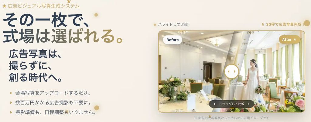 イメチェンは、汎用的な画像変換ツールではなく、結婚式会場という専門領域に特化して開発されています。