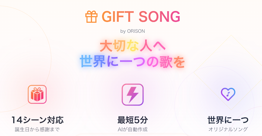 「ORISON(オリソン)」のギフトソングは、贈る相手との思い出やエピソード、伝えたい気持ちを入力するだけで、AIが歌詞・作曲・編曲までを行い、世界に一つだけのオリジナル楽曲を制作します。
